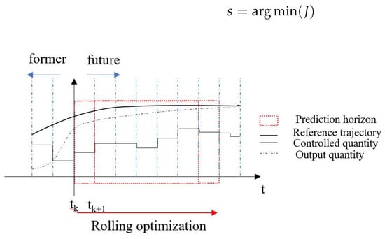 According to the previous discussion, equivalent factors need to be adaptively adjusted. In the case of completing speed prediction, the combination of predictive speed and energy management can be achieved through the MPC framework, and the automatic adjustment of equivalent factors can be achieved through short-term planning. Combining any control method with the highly adaptable MPC control architecture can achieve real-time control. The fundamental premise of predictive control is to forecast the system’s future output using the present model, the status of the system at hand, and upcoming control variables. Three elements comprise its management process: the rolling optimization, the feedback adjustment, and the forecast model. The MPC solution process is shown in Figure 15.