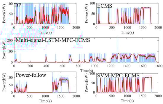 Here, we mainly focus on the multi-signal LSTM vehicle speed prediction MPC-ECMS (multi-signal-LSTM-MPC-ECMS). We set the initial SoC to 0.3 for the conducted simulation, and compared the control effect of the proposed strategy with the MPC-ECMS under SVM vehicle speed prediction (SVM-MPC-ECMS), dynamic programming (DP), ECMS ( 2.5) and power-following control strategy. Each control strategy used the same coefficient for filtering, and the comparison before and after power noise filtering is shown in Figure 16.In the figure, the red line indicates the signal change after filtering and the blue line indicates the signal change before filtering. The final SoC and fuel consumption before and after filtering for each control strategy are shown in Table 4. When the entire working condition is in the pure electric drive mode, the final SoC is 0.2349. The experimental results under various control strategies show that the SoC is still within the allowable range after filtering. A greater reduction in fuel consumption is achieved relative to the reduction in SoC.