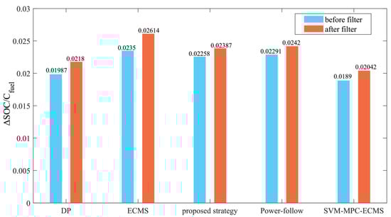 As shown in Figure 17, the ordinate is , is the difference between the final SoC under this control strategy and the final SoC under the pure electric drive mode, and is the total fuel consumption under this control strategy. The results show that SoC variation under unit fuel consumption after filtering is significant, so filtering is helpful for fuel saving.
