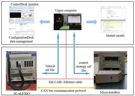 In order to validate the precision and real-time effectiveness of the control strategy, a HIL simulation experimental platform was built to simulate the multi-signal LSTM-MPC-ECMS control strategy. A schematic diagram of the HIL is shown in Figure 18. The HIL simulation experimental platform equipment mainly consists of an upper computer, a MicroAutoBox controller, and a SCALEXIO real-time simulation hardware system. The upper computer is responsible for monitoring the entire simulation process and saving the results, the controller is responsible for simulating the electronic control unit, making decisions according to the control strategy, and the real-time simulation hardware system is used to simulate the behaviour of the whole vehicle, providing a complete vehicle environment for HCU. SCALEXIO and AUTOBOX are connected to the upper computer through network cables, and the harness interface connects SCALEXIO to the expansion version. SCALEXIO is connected to the expansion board of AUTOBOX through the CAN high/low lines for signal transmission.