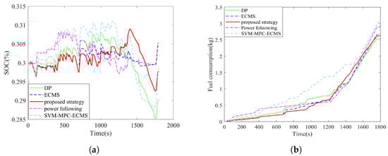 Graph of changes under various control strategy SOCs. (a) Comparison of the changes in SoC for different control strategies; (b) the fuel consumption of the different control strategies.