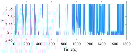 To achieve adaptive adjustment of the equivalent factors, the equivalent factors are first discretized with a suitable range at certain intervals. We use the multi-signal vehicle speed prediction model introduced in Section 3.3 to predict the speed in the next 5 s. The power generation range of the generator is from 0 to 285 kW, while the range of discretized equivalent factors is from 2.48 to 2.68. Then, the predicted velocity sequence is input into the control strategy by the prediction model. The control strategy calculates the required power sequence in 5 s based on the speed sequence. The best control sequence is calculated using PMP under different equivalent factors, and its fuel consumption and performance indicators are calculated accordingly. Since the performance indicator already considers the impact of the target SoC in the minimum principle, the calculated control variable enables the SoC satisfy the constraints. Finally, among all the corresponding relationships between the equivalent factors and the performance indicators, the equivalent factor that minimizes the performance indicator is selected as the designated equivalent factor s for the next moment. Meanwhile, the first control variable of the output sequence corresponding to the equivalent factor s is output as the output power of the range-extender at the next moment. The formula to solve the equivalent factor s is shown in Equation (27).