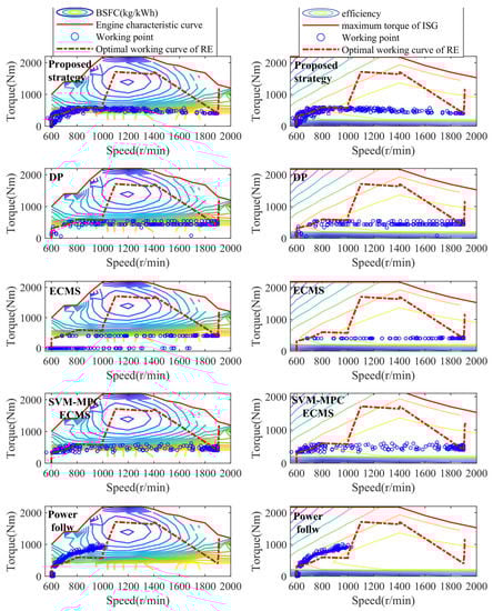 Figure 22 shows the working points of the engine and generator under various control strategies; the dotted line in the figure is the optimal working curve of the range-extender. The engine and generator jointly influence the optimal working curve of a range-extender; therefore, the optimal working speed and torque should be calculated based on this curve. From the distribution diagram of the working points, we find that most of the working points of the MPC-ECMS control strategy are concentrated near the optimal curve, whether it is the MPC-ECMS method proposed in this article or the SVM-MPC-ECMS, in which the points that are not on the optimal curve are mainly the operating points in the speed transition stage. It can be seen that improving the prediction accuracy and extending the prediction time domain in order to optimize over a longer period of time can enable the range-extender to work nearer the optimal curve. We believe that improving the prediction accuracy while extending the prediction time domain will not only allow control strategies to have longer planning time and greater control accuracy, but also make full use of the high-efficiency range of the engine, reducing the rapid changes in speed and torque in a short time, and thereby improve the overall fuel efficiency. However, the optimal working curve of the range-extender is significantly influenced by the generator’s efficiency, resulting in a difference between the optimal operating curves of the range-extender and the engine. This difference can be seen from the fuel consumption and working point distribution of engines with different control strategies.
