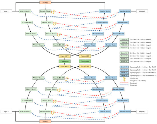 This paper proposes a new deep-learning architecture, Fuzzy Double-Butterfly Network (DBNet), in which two images with complementary properties can be input to perform image segmentation. It is mainly composed of three parts: double-butterfly encoder–decoder architecture, Fuzzy Atrous Spatial Pyramid Pooling (ASPP) block and an attention gate, as shown in Figure 1.