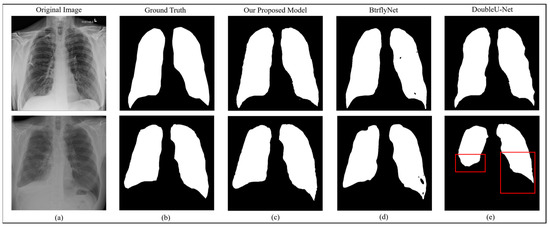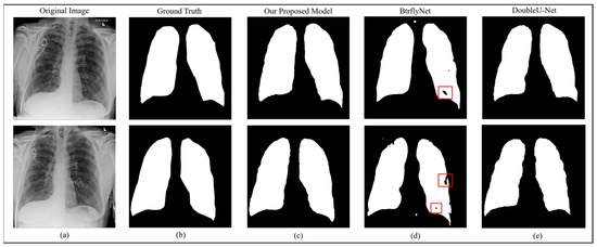 A pair of lung images (a). Ground truth images (b). Our Proposed Model (Fuzzy DBNet) results (c). BtrflyNet results (The red square in the caption highlights the missing output of BtrflyNet.) (d). DoubleU-Net results (e).