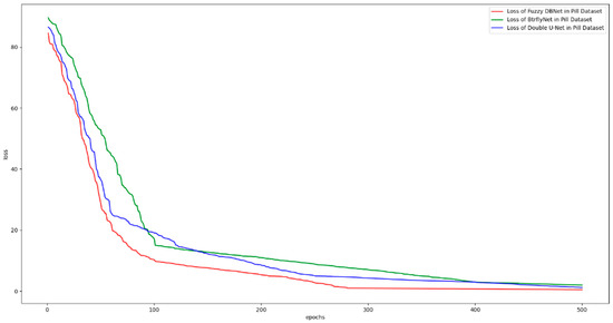 Validation loss of Fuzzy DBNet, BtrflyNet, and Double U-Net models on the Pill Dataset.