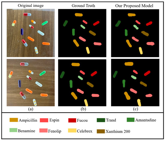 (a) a randomly selected pair of pill images, (b) corresponding ground truth images and (c) segmentation images.