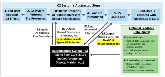 To lay groundwork for an RS design, RS data inputs/outputs from the C2 system are identified and summarized in Figure 2. Within these abstracted steps of a C2 system, we portray how the RS can interact with a C2 system for both (1) minimizing the C2 search space as a metaheuristic and (2) ranking final offers to be presented to the end-user.