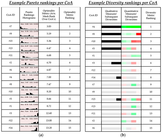 Example rankings per CoA for measures of (a) Optimality using our “Pareto-mesh” technique and (b) Diversity using our “linchpin-based qualitative/quantitative diversity” technique, where green denotes a higher score and red denotes a lower score.