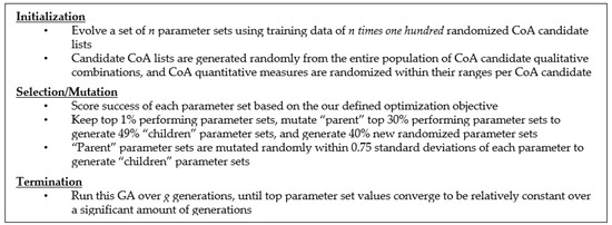 GA tuning of all measures in unison resulted in the final hyperparameters provided in Table 3. The dataset used for this final tuning consists of a total of 11,664 unique combinations of CoA qualitative data, and quantitative data are randomized each GA generation cycle. A 50% training/testing data split percentage was used during this final tuning procedure, mimicking the low availability of realistic training data.