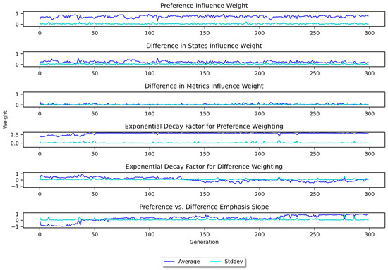 We next discuss the tuning results of the RS measures of Feedback, Optimality, Diversity, and Preference. We aim to optimize RS measures using the GA optimizer summarized in the previous section. First, we share results of GA optimization when only the Optimality and Diversity measures are considered, simplifying the explanation of the results by disregarding the Preference and Feedback metrics which require human parameter input. Figure 5 provides these GA optimization results for the Optimality and Diversity measures only. The dataset used consists of a total of 11,664 unique combinations of CoA qualitative data, and quantitative data are randomized each GA generation cycle. In the GA parameter search plot provided, we see each parameter’s trend across 300 GA generations. We see that convergence is reached for all 5 parameters due to minimal parameter value changes within roughly the last 50 generations.
