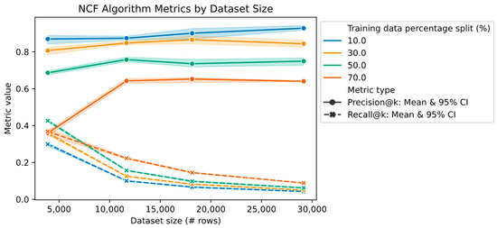 We next discuss how the Feedback measure is tuned. The Feedback measure is calculated via a trained collaborative filtering model, where we query using C2 request and CoA details and receive the expected Feedback rating. Input data are formatted for collaborative filtering methods to be compatible with algorithms such as Neural Collaborative Filtering (NCF). Coarse parameter searches are conducted, and adequate performance is ensured through bias/variance analysis of the training curves. When tuning the models considering both evaluation criteria Precision@K and Recall@K, we are aiming to optimize Precision@K while ensuring Recall@K does not fall unreasonably low, because in the C2 RS domain, we prefer a short list of highly relevant recommendations than a longer, possibly less targeted list. For understanding the effect of expected total dataset size on Feedback metric performance, input data are varied to the following number of dataset rows: 1944 rows, 3888 rows, 11,664 rows, 18,144 rows, and 29,160 rows. These rows represent unique combinations of qualitative CoA and user/request data, where the Collaborative-Filtering-formatted data are aggregated to have columns “CoA ID”, “User ID”, and “rating” for ease of computation. Each “CoA ID” represents all combinations of C2 domain types, domain schemes, actor/personnel types, and actor/personnel IDs. Each “User ID” represents all combinations of columns, i.e., all unique combinations of qualitative user/request options.