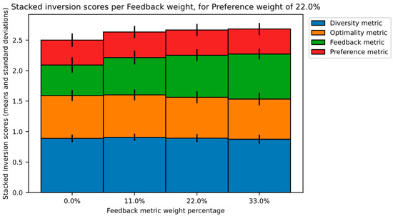 GA optimization results of all 4 metrics, assuming human input of 22% for Preference weight and varying between 0%, 11%, 22%, and 33% for the Feedback weight.