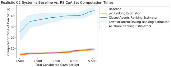 We compare these Optimality ranking estimators against a baseline combinatorics case. This baseline case instantiates all possible CoA options, with no RS search space reduction implemented. These ranking estimators all displayed significant benefits in CoA computation time through reducing the C2 exploration search space. Figure 9 shows that the baseline C2 method has a high linear trend of increasing computation time with an increase in CoAs considered per run, while each of the ranking estimators show much lower linear trends. This is largely due to this simplified RS’s search space reduction capability in minimizing the costly instantiation time of each CoA. Each of the ranking estimation methods also show similar trends comparing computation times, due to their similar algorithmic methods of reducing search space before CoA instantiation.