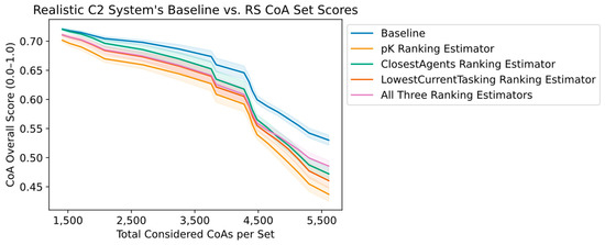 Next, we compare the overall C2 metric scores produced by the ranking estimation techniques against the baseline using Figure 10. The baseline algorithm serves as the theoretical optimal performance of each CoA run, due to its instantiation of all possible CoA options. We see that all ranking estimators are able to follow reasonably close to the theoretical optimal performance. Variation in the baseline’s theoretical optimal score is due to the randomized scenarios tested for each CoA set. The “pK” ranking estimator scores within roughly 13.6% of the baseline score on average across the CoA set sizes, while the remaining three ranking estimators score within roughly 9.5% of the baseline theoretical optimal score.