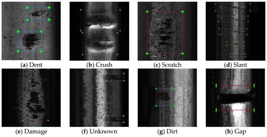 Depending on the classification standard of injury and damage, and the study of the formation mechanism of rail surface defects, common defects on rails are as follows: (a) Dent: oval-shaped edge, only locally present; (b) Crush: obvious transverse depression; (c) Scratch: longitudinal slight long strip damage; (d) Slant: tear in the side of the rail surface; (e) Damage: parent material from rail surface displacement; (f) Unknown: cannot clearly determine whether it is damage, needs manual confirmation; (g) Dirt: paint or dirt covering the rail surface; (h) Gap: weld or obvious break between adjacent rails. The above eight types of defects are shown in Figure 1 below.