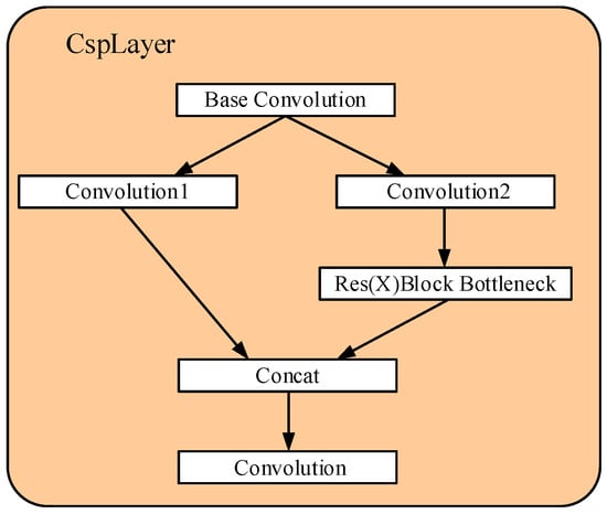 CSPDarkNet, which employs the focus structure rather than convolution to compress the width and height of the input image, is used as the backbone feature extraction network in YOLOX. A cross-stage local network CspLayer, as shown in Figure 6, is introduced in the network instead of the original residual structure. The SPPBottleneck is also introduced into the network to increase the perceptual field and feature extraction capability of the network through the maximum pooling of different pooling kernels for feature extraction. The problem of over-learning is effectively avoided by using the SiLU activation function, which is shown in Equation (12).