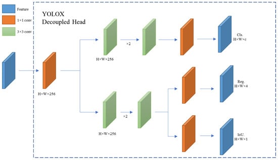 A lightweight decoupling header with a separation of the localization and classification processes is introduced on the prediction side of YOLOX, which is structured as follows. The branch output of the predicted category is in the form , the branch output of the predicted location is in the form of , and the branch output of the predicted IoU score is in the form of . The feature map’s dimensions are and , and stands for the target’s category count. By using a lightweight decoupling head, the network convergence speed of YOLOX is improved. YOLOX decoupled head is shown in Figure 7.