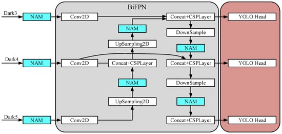 In Equation (13), and denote the input and output features, respectively. The normalization and ReLU functions are used to make the weights . is minimal and to keep the values stable. The backbone part of the network in this study extracts three effective feature layers, so the BiFPN is simplified (denoted as BiFPN-Tiny) to reduce computation while adapting the network. Figure 9b depicts the BiFPN-Tiny network structure.