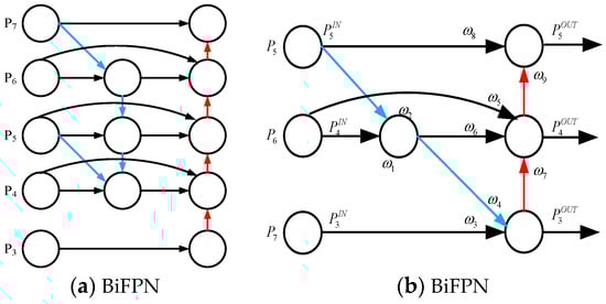 To combine the feature information of various scales in the backbone network, BiFPN uses the same bi-directional channels of up- and down-sampling as PANet. Figure 9a depicts the structure of the BiFPN network, where the blue arrows indicate down-sampling and the red arrows indicate up-sampling. The input feature layer in the first column is half the length and width of the previous layer from top to bottom. The feature layers in the second column form the top-down pathway, accepting feature information from this level and the previous level, splicing and performing convolutional fusion, and then passing it into the next level and the bottom-up pathway. The feature layer in the third column constitutes the bottom-up pathway, which transmits the incoming features to the next layer or for prediction after convolutional fusion.
