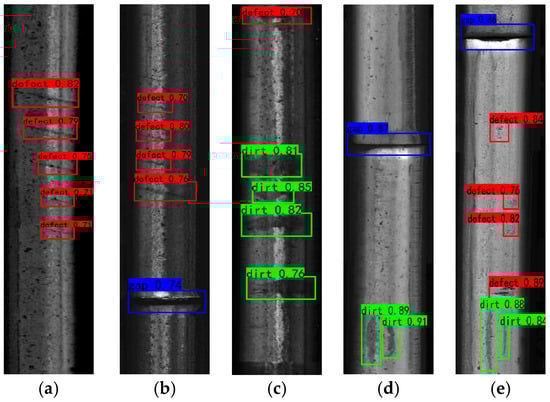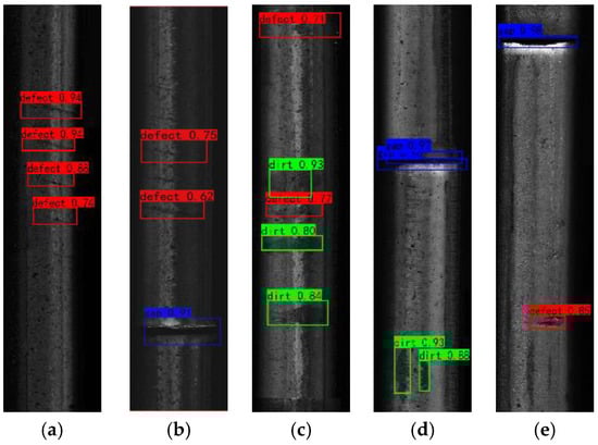 The detection results for YOLOX and the algorithm used in this paper are shown in Figure 11 and Figure 12, respectively. It is clear from the comparison that there is a significant difference between the actual detection effect predicted by the previous model and the improved model in this work. YOLOX displays a missed detection in the detection results of Figure 11a,b, and it is challenging to precisely detect the tiny Defects; so, the detection results are unsatisfactory. YOLOX displays false detection and repeated detection in the findings provided in Figure 11c,d, which negatively impact the repair method and defect statistics during field inspection. Due to the darkness of the image itself and the findings displayed in column (e) of Figure 11, YOLOX was unable to detect the subtle dirt, and the fine defect was also not quantified. In contrast, the improved model presented in this study has a strong detection effect, no miss detection, no false detection, and can reliably detect minor defects, making it appropriate for the task of detecting rail surface defects.