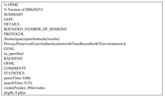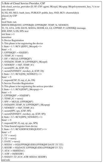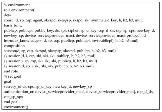 In Figure 8, different from the previous script of the roles in the parentheses, in other words (), the header of the environment is empty parentheses. All variables are declared and instantiated using the “const” keyword. The agents, D, SP, and CSP, are instantiated as d, sp, and csp, respectively. Symmetric keys, skcspd, skcspsp, and skspd, are also instantiated, representing SKcspd, SKcspsp, and SKspd. However, a new symmetric key, ski, is introduced as an instance that an intruder can use. The hash function is instantiated as h, h2, h3, and mul, representing H, H2, H3, and MUL, respectively. Two public keys based on the elliptic curve cryptosystem are instantiated as publicp, representing PUBLICKP, and publicpi, which is built for the intruder. The “protocol_id” keyword declares the identifiers mentioned earlier for the goal section. The “intruder_knowledge” keyword is used to define the knowledge that the intruder possesses, including all agents, public keys (including the intruder’s public key), and hash functions. The “inv()” keyword is used to invert a key, allowing AVISPA to convert a given public key to a private key. Each session is composed of a “session” keyword and all the instances. These sessions simulate possible attacks on the protocol under the symmetric key, ski. The goal section is critical for AVISPA to validate the safety of the protocol SAFE or UNSAFE. The “secrecy_of” keyword is used to indicate that the identifiers and related instances are intended to keep secrets, such as ds, sps, and sp_d_key. The “authentication_on” keyword is used when agents request authentication, such as device_serviceprovider_maci, device_serviceprovider_macj, csp_d_ds, csp_sp_sps.