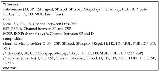 Figure 7 illustrates the role of the session, which involves the device, Service Provider, and CSP. The starting parts of the script are the same as in the device role, including the symmetric keys (SKcspd, SKcspsp, SKspd), (H, H2, H3, MUL), the public key (PUBLICP), and communication channels (SND, RCV). However, after the “def=” keyword, the communication channels for each agent are declared as local variables, and each agent is assigned to send and receive channels. To compose the session and communicate across different channels, the keyword “composition” is used to instruct AVISPA on how the session is constructed. The session is built up with the CSP, device, and Service Provider, with the same header information as in the agent roles, including symmetric keys, hash functions, public key, and communication channels. Once the communication channels (SD, RD, SSP, RSP, SCSP, RCSP) are assigned to their respective agents, the session is complete. Finally, the script concludes with the “end role” keyword to ensure proper operation.
