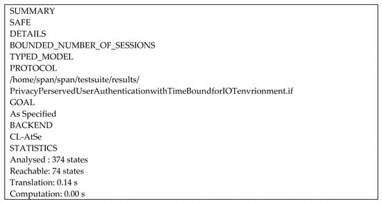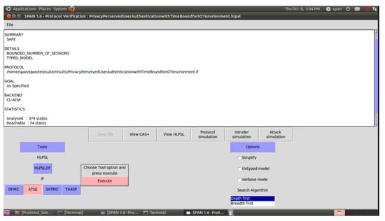 The snapshot of the formal security analysis of the proposed protocol using CL-AtSe back-end.