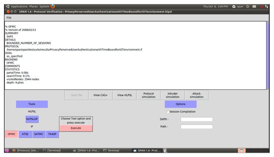 We examine and test our suggested protocol using the OFMC and CL-AtSe back-end checkers. The OFMC report, presented in Figure 9, confirms that our protocol is secure and meets all the security goals we designed. We also use the CL-AtSe back-end checker to validate our protocol, and Figure 10 shows the results, indicating that our protocol is secure and satisfies the security goals. To provide a reference, we include execution snapshots in Figure 11 and Figure 12.