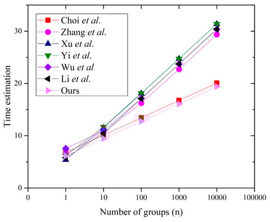: × → implies the permitted bilinear map. Besides, the generally adopted 80-bit security (equal to RSA-1024 bit or ECC-160 bit) level is regarded. Therefore, we organized the operation time consumption in Table 3 for the comparison in Table 4 with an illustration in Figure 13. The y-axis of Figure 13 is the estimated time for calculation, which is applied with logarithm adjustments with the base of two and the x-axis is the number of groups.