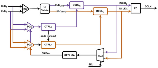 The proposed DC-DL DLL structure shown in Figure 5 was divided into two loops, and the delays of each loop need to satisfy Equation (1). Since the two loops were controlled by two controllers, CTRLE and CTRLO, respectively, the control signals of the two delay lines, DCDLE and DCDLO, can be different. At this time, the two loops satisfied Equations (2) and (3), respectively.
