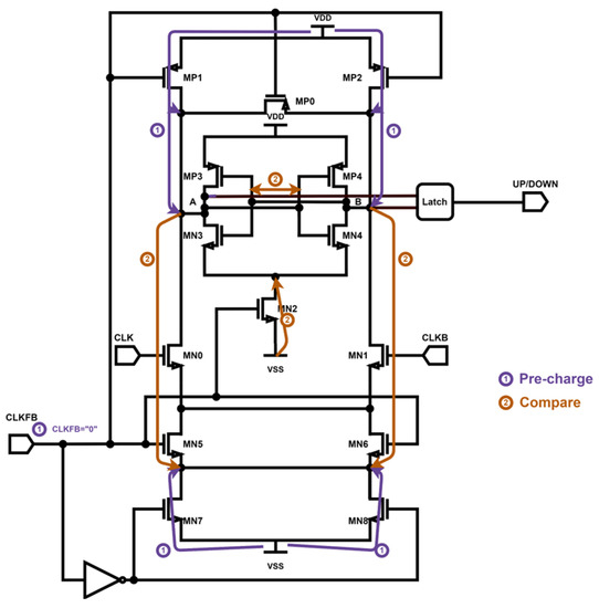 A block diagram of the phase detector (PD) is presented in Figure 7. Due to the addition of the frequency divider, the clock signal frequency at the input of the phase detector in the current structure was different. Therefore, the bang-bang phase detector structure used can work normally when the input clock frequency was different. The working state of the bang-bang phase detector was divided into “Pre-charge” and “Compare”.