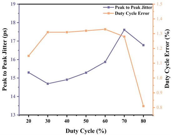As the duty cycle of the external input clock was altered from 20% to 80%, it can be observed from the results presented in Figure 12 that the proposed DC-DL DLL was capable of maintaining normal locking functionality, with the duty cycle of the final output clock remaining stable between 48.67% and 51.3%. Upon stabilization of the DLL, the peak-to-peak jitter values of the output clocks corresponding to different duty cycle input clocks were 15.73 ps, 14.69 ps, 14.91 ps, 15.29 ps, 15.87 ps, 17.61 ps, and 16.78 ps, respectively. The simulation results showed that the proposed DC-DL DLL structure had excellent jitter stability in the full input duty cycle range.