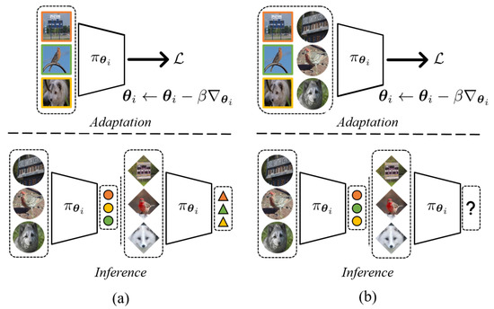 - Ren, M.; Ravi, S.; Triantafillou, E.; Snell, J.; Swersky, K.; Tenenbaum, J.B.; Larochelle, H.; Zemel, R.S. Meta-Learning for Semi-Supervised Few-Shot Classification. In Proceedings of the International Conference on Learning Representations, Vancouver, BC, Canada, 30 April–3 May 2018. [Google Scholar]