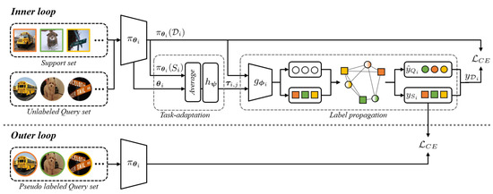 The primary objective of meta-learning is to transfer meta-knowledge, which refers to shared information across tasks [12]. Notable meta-learning strategies are divided into several categories, e.g., metric-based [13,14], optimization-based [5,15,16], and model-based ones [17,18,19]. Metric-based algorithms map and adapt each input into an embedding space via an embedding function. Here, the embedding function clusters samples in class units through the training set and makes other classes more distant from each other. Optimization-based algorithms literally optimize the adaptation process. They do not use hand-crafted update rules, but rather make decisions through learning to better adapt to few-shot data. Meanwhile, in model-based meta-learning, sub-networks are employed for the adjustment stage. For example, one approach is to encode the training set using this sub-network model [20]. They encode the training set to parameterize a given task or utilize a separate buffer. The proposed TSPL encodes a task and performs label propagation based on it. Hence, TSPL is classified as a model-based approach.