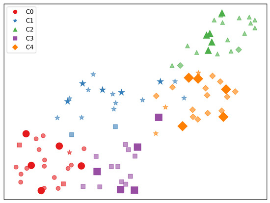 In this section, the visualization in the embedding space investigates the association between UQS and QS. We employ UMAP [35], a popular non-linear dimension reduction technique commonly used to visualize the embeddings of examples. UMAP makes us identify the relationship between the pseudo-labelled UQS and the SS of the same class. The UMAP for miniImageNet is visualized in Figure 3. This is for five-way 5-shot classification. With each colour indicating the class indicated by the PL, the geometric figures represent distinct GT classes. The support set (SS) is represented by figures that are larger in size and have a darker colour, while the query set (QS) is represented by smaller figures with a lighter colour. For instance, a sample in the QS can be depicted in blue (representing C1) and circle shape (representing C0), if it has a GT label of C0 and a PL of C1. Figure 3 reveals that majority of samples in the UQS are located near the SS of each ground truth label. Additionally, it is observed that the PLs align with the corresponding GT labels. This indicates that by constructing task-specific graphs, TSPL achieves effective pseudo labelling, thereby yielding positive outcomes for adaptation.