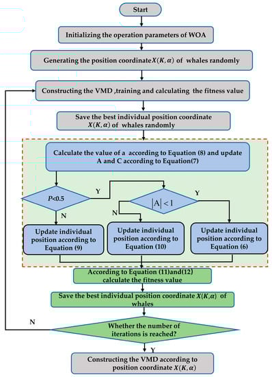 To pick the ideal parameter combination, the two-parameter choices are also taken into account. The flow chart of the WOA–VMD optimization is shown in Figure 1.
