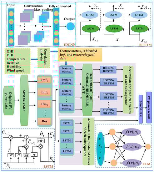 The MVMD–CLES is based on the whale optimization algorithm (WOA), variational mode decomposition (VMD), convolutional neural network (CNN), long and short-term memory (LSTM), and extreme learning machine (ELM) stacking. The summary of the entire procedure is presented in Figure 2. The specific implementation steps of the proposed photovoltaic power generation prediction model were as follows: