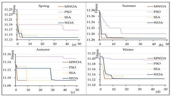 Deep learning (DL) is a renowned subfield of machine learning that has gained popularity in recent years and is frequently active across a variety of engineering specializations. As portrayed in learning features and the modeling of complicated interactions, deep learning models provide excellent prediction powers []. The most notable DLs-based PVPF models employed include the ELM [,], SVM [], BP [], CNN [], and LSTM []—a numerous combination of structures. These approaches exhibited adaptability and accuracy in solar energy production predictions. With the continuous development of intelligent optimization algorithms, many scholars are committed to combining algorithms with deep learning networks, striving to find the optimal parameters of the model through optimization algorithms, such as using the PSO [] to optimize Bi-LSTM, the SSA [] to optimize LSTM models, and using the WOA [,] to optimize BiLSTM, ELM, etc. to reduce the impact of model parameters on prediction results and improve prediction accuracy.