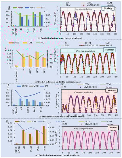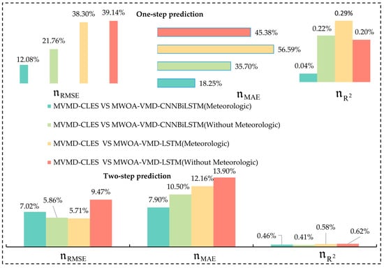 (c) This survey’s technique usually yielded a lower RMSE and MAE predictive performance, as seen above. The experimental findings showed that the proposed hybrid integrated deep learning model was more effective, owing to the data reconstruction for distinct time-frequency components with the VMD. While the CNN–BiLSTM and data decomposition can extract intrinsic and periodic characteristics, meteorological factor variables were inserted according to climatic circumstances, and the PV power and meteorological factors were modeled individually to derive characteristics. As a final note, the results of each branch were integrated by stacking, and the ELM was used as a secondary prediction model to finally obtain the forecasted outcome. This strategy enhanced the model’s forecast and eliminated weather-related fluctuations.