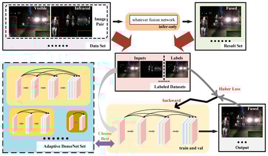 The diagram in Figure 1 depicts the proposed methodology’s framework. Our approach involves treating the amalgamation of visible and infrared images as a knowledge distillation of the neural network fitting problem. Specifically, we leverage pre-existing fusion models and feed them with pairs of visible and infrared images to obtain fused images. As a result, we construct a dataset comprising visible–infrared image pairs as inputs and fused images as labels. Subsequently, we perform supervised learning on our fusion model using the Adaptive DenseNet and Huber Loss network models for convergence. To this end, we construct an Adaptive DenseNet set that facilitates the selection of the optimal DenseNet network architecture for our fitting task. Importantly, our network model is characterized by a reduced complexity, a smaller storage size, and fewer parameters when compared to existing trained models, while delivering equivalent or superior image fusion performance.