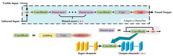 The structure of the proposed adaptive DenseNet is presented in Figure 2, and it integrates two variables that function to regulate the network structure and hyperparameters of the adaptive DenseNet for implementing knowledge distillation. Input visible and infrared image pairs are concatenated and subjected to ConvBlock processing within dense layers (n), where n represents the number of dense layers, akin to depth in the YOLO network. A dense layer is composed of ConvBlock and concatenation modules, with the latter facilitating the integration of input and ConvBlock features at the next level, where m represents the number of each dense layer output channel produced by the ConvBlock, similar to the width in the YOLO network. Finally, convolution and the Tanh activation function are used to obtain the fusion output (comprising three channels).