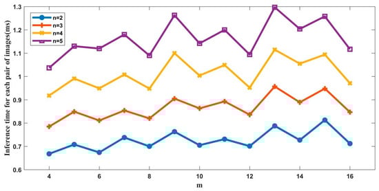 Step 1 (Pre-Processing Stage): To begin with, the time required to perform inference for each pair of images is calculated for a fixed (n, m) value and given typical input image pixels in order to adaptively select the model structure with the shortest inference time in subsequent operations. Figure 3 demonstrates the adaptive DenseNet’s inference time per pair of images, while processing the fusion of 640 × 480 size infrared and visible light images with varying n ∈ [2,5] and m ∈ [4,16]. In this figure, the horizontal axis represents the number of output channels in each dense layer (i.e., m value), while the four curves represent the number of dense layers (i.e., n value) ranging from 2 to 5. The vertical axis shows the inference time, measured in milliseconds, required for each pair of infrared and visible light images, and represents the average of 10,000 tests. Upon analyzing Figure 3, it is evident that the inference time does not necessarily increase with an increase in m, while n is constant. Moreover, when m is a power of 2, the model complexity increases without an increase in inference time, indicating a higher cost-effectiveness. Therefore, we eliminated the low cost-effective DenseNet network structures constructed with certain (n, m) values during the pre-processing stage. For instance, the DenseNet network structure with n = 2 and m = 11 has a significantly lower actual complexity than that of n = 2 and m = 12, but its inference time is significantly higher. Table 5 presents the optional adaptive DenseNet network architectures sorted by inference time from low to high after removing the low cost-effective (n, m) values, where each (n, m) pair corresponds to a sequence number s.