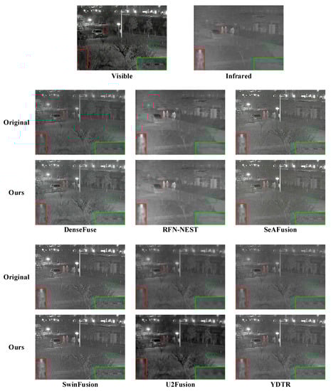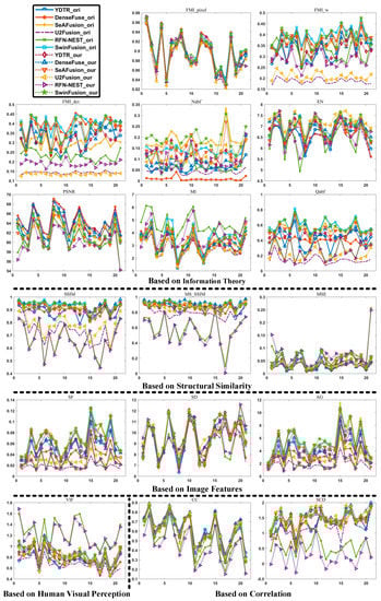To test the effectiveness of the proposed distillation model and the efficacy of dual-light image fusion, we evaluated the performance using six popular fusion models and their corresponding distilled models on 21 pairs of VIFB images. A set of 17 commonly used metrics were employed to assess the performance. Figure 5 presents the results of the quantitative analysis using 17 metrics on the 21 pairs of images. It can be observed that the distribution of fusion results obtained by our proposed method using the distilled models is similar to that of the original models with respect to the corresponding evaluation metrics. Specifically, based on the information-theory-based EN metric, the algorithm fitted to the U2Fusion method achieves the best performance on most image pairs, indicating that the proposed distillation method can still enrich the information in the images when fitting the U2Fusion fusion algorithm. This is mainly because the obtained corresponding adaptive DenseNet not only regresses to the result of the U2Fusion algorithm, but also can obtain information from the input visible–infrared images.