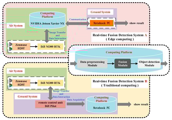 This section presents the practical implementation and analysis of our algorithm deployed on mobile platforms. In order to demonstrate the efficacy of our approach, we design and implement a real-time fusion detection system as per the framework illustrated in Figure 6. The system utilizes a DJI M300 RTK unmanned aerial vehicle as the airborne payload platform and a Zenmuse H20T as the visible light and infrared sensor payload. In our real-time fusion and detection system scheme A, we employes an NVIDIA Jetson Xavier NX as the computing platform and directly installed it on the drone to perform data acquisition, visible light and infrared image fusion, and target detection of the fused image. Subsequently, the fusion detection results were transmitted to a laptop for display. In contrast, in the real-time fusion and detection system scheme B, a laptop functions as the computing platform. The laptop reads the required visible and infrared images from the DJ remote control and conducts visible and infrared image fusion, followed by detecting targets in the fused images. The fusion detection results are displayed simultaneously.