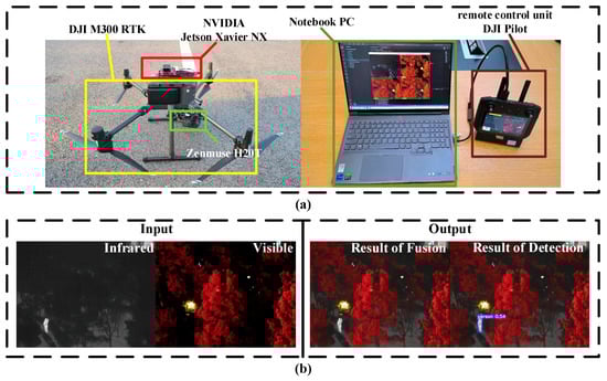 In Figure 7a, the real-life application setup of the deployment experiment is depicted. The left image displays the unmanned aerial platform with a payload section, while the right image showcases the ground dual light image data processing section. Specifically, the Zenmuse H20T, with infrared images on the left and visible light images on the right in each frame, can generate a 30 fps and 1080 p video output. The laptop used in this experiment features an Intel Core i7-12800HX CPU and an NVIDIA GeForce RTX 3070Ti Laptop GPU with 8 GB memory. Moreover, the NVIDIA Jetson Xavier NX comprises a six-core NVIDIA Carmel ARM processor and an NVIDIA Volta architecture graphics card with 384 NVIDIA CUDA cores. Figure 7b displays the outcomes of the real-time fusion detection algorithm utilizing the adaptive DenseNet fitting SeAFusion. For the detection algorithm, yolov5s was utilized as the network structure adopting YOLOv5. Notably, our algorithm produces comparable results to the original SeAFusion. The fusion results demonstrate that individuals can be distinctly differentiated and the detection network can correctly identify targets in the fused image.