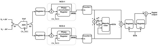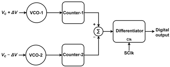 The conventional differential architecture for a VCO-based ADC is shown in Figure 1, where is the measured input voltage and SClk is the external sampling clock. The expression for the digital output is given in (1), where is the digital output, is the period of the external sampling clock, is the gain of the VCOs, is the quantization error, and and are frequencies of VCO-1 and VCO-2, respectively.