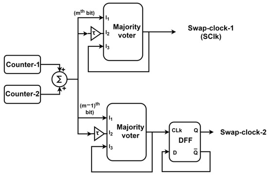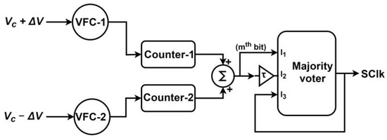 Since the sampling clock is derived from a combinational adder circuit, glitches may appear due to a difference in various path delays, which is disastrous for a clock line. To mitigate this problem a three-bit majority voter is used after the adder’s mth bit output whose inputs are connected, as shown in Figure 2. Most of the time all three inputs have the same bit values. If a glitch occurs at I1, then I2 and I3 will still be the same, making the output unaffected. If the delay of the buffer, τ, is chosen to be sufficiently longer than any appearing glitch, then by the time this glitch arrives at I2, the input line I1 resumes its state and I1 & I3 will be the same, making the output unchanged again. In such a way, the output of the majority voter becomes glitch-free, which makes it suitable to clock subsequent circuits.