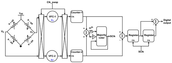 Wheatstone bridge configuration is a well-known way to interface resistive sensors. Its typical advantages include its output linearity and ability to suppress temperature drifts of the resistive sensors. However, the bridge output voltage is directly proportional to the excitation voltage, which makes it highly susceptible to supply voltage variations. The use of the adaptive clock frequency presented in Section 2 will have an interesting result when used in the Wheatstone bridge interface. The full architecture is depicted in Figure 4.