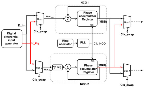 VFCs with a frequency of up to 100 MHz have been reported with a non-linearity below 0.06% [22]. Based on this, to assess the performance of the first architecture, the proposed structure is implemented on a field-programmable gate array (FPGA) where sine-modulated VFC outputs are emulated with digital components as in [16] with around 0.1% non-linearity. The block of the detailed implemented structure in this work is illustrated in Figure 6. To perform dynamic performance tests, the digital differential input generator synthesizes differential digital sine inputs using a sixteen-stage coordinate rotation digital computer (CORDIC) algorithm as in [16]. On the other hand, to estimate the static performance, differential dc inputs with peak values are used. The swapping circuits are then implemented with multiplexers (Mux-1, Mux-2, Mux-3, and Mux-4) as shown in Figure 6, whose select inputs are controlled by the swapping clock (Clk_swap). The clock supplies of the NCOs are derived from a PLL driven by a ring oscillator.